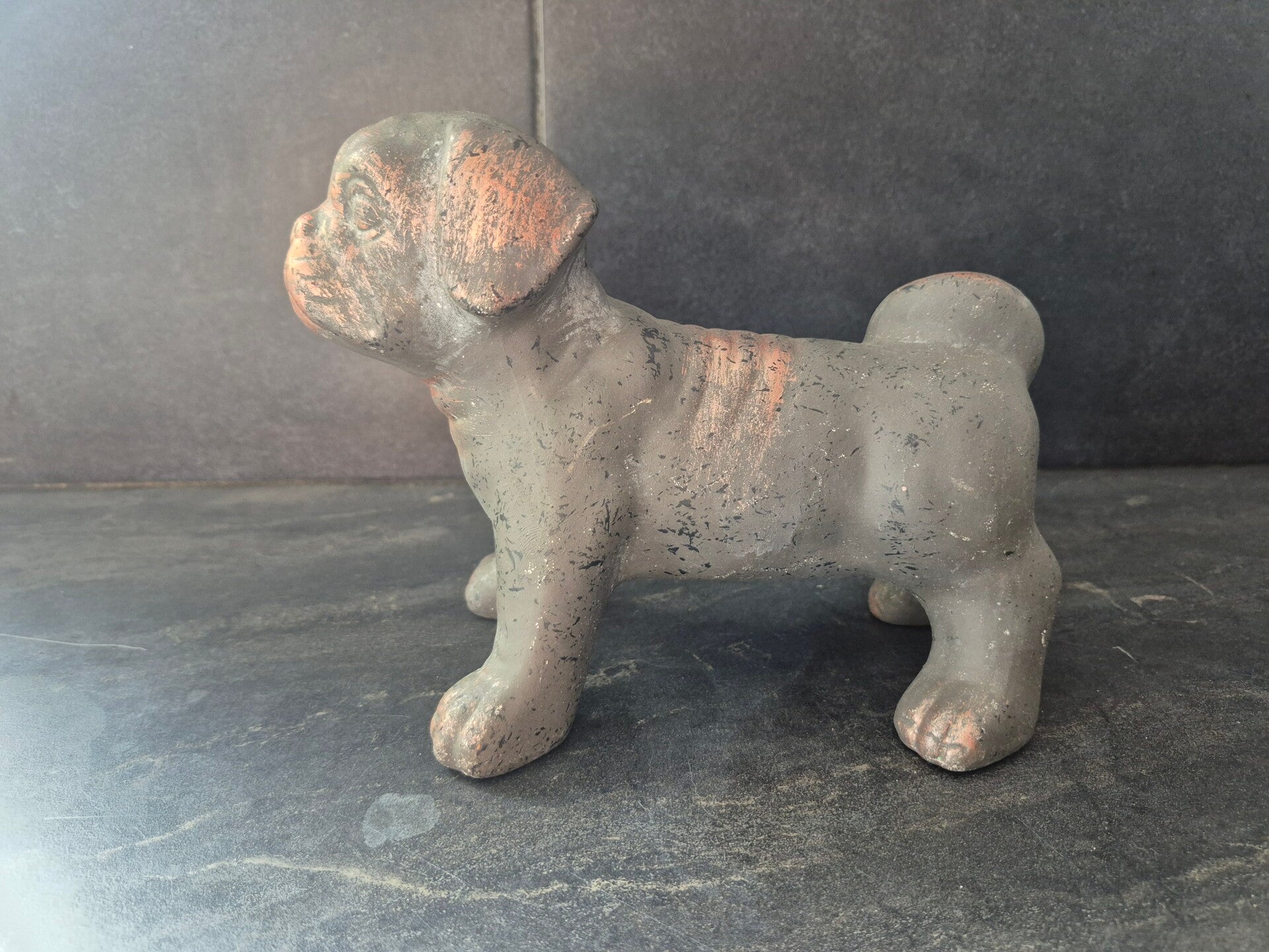 Breng een vleugje warmte en charme in je interieur met deze prachtige zittende hond van terracotta.